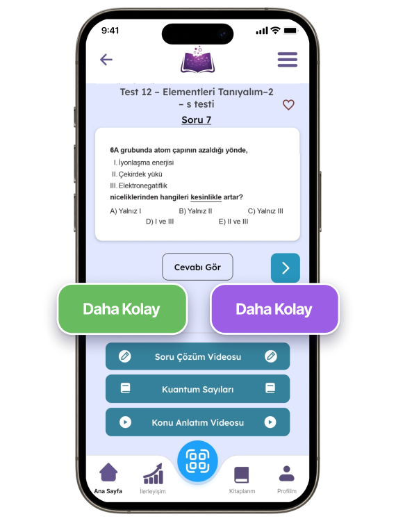 Kitap üzerinde bulunan QR kodları telefonunun kamerasıyla veya uygulama içindeki QR okuma özelliğiyle taratabilirsin. Kod okunduğunda ilgili kitap, test veya çözüm ekranı otomatik olarak açılır.